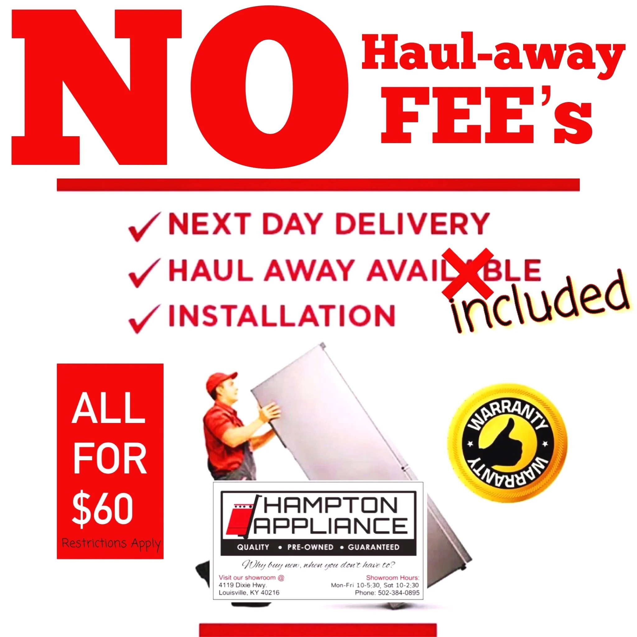 Hours: Monday - Friday 10:00am - 5:30pm. Saturday 10:00 - 2:30pm. Closed Sundays. π΄ππ΄ 30 Day Guarantee on ALL appliances ππ΄π $60 DELIVERY! Anywhere in Jefferson County. (Surrounding areas available for addt'l fee). ππ΄π